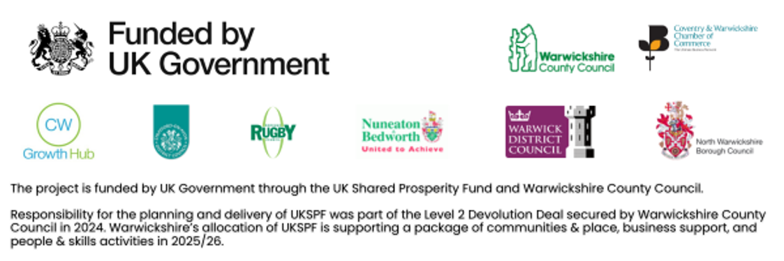 *This project is part funded by the UK Government as part of the UK Shared Prosperity Funding (via Nuneaton and Bedworth Borough Council, Rugby Borough Council, North Warwickshire Borough Council and Warwick District Council). Funding is also provided by Warwickshire County Council and Stratford District Council. As well as funding by Coventry City Council.