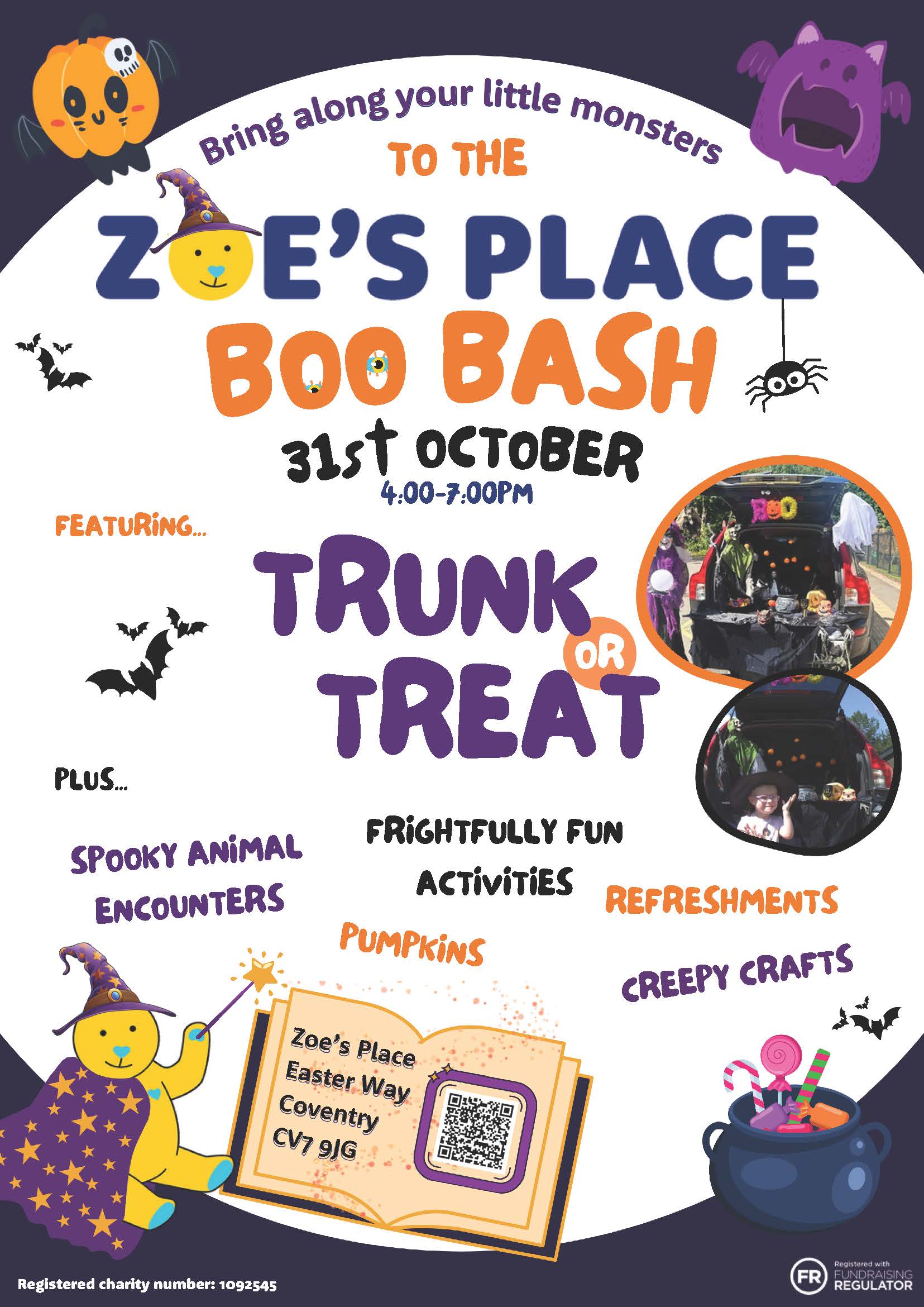 Looking for a safe way to trick or treat this spooky season, then why not come along to the Zoe’s Place Boo Bash for our Trunk or Treat!