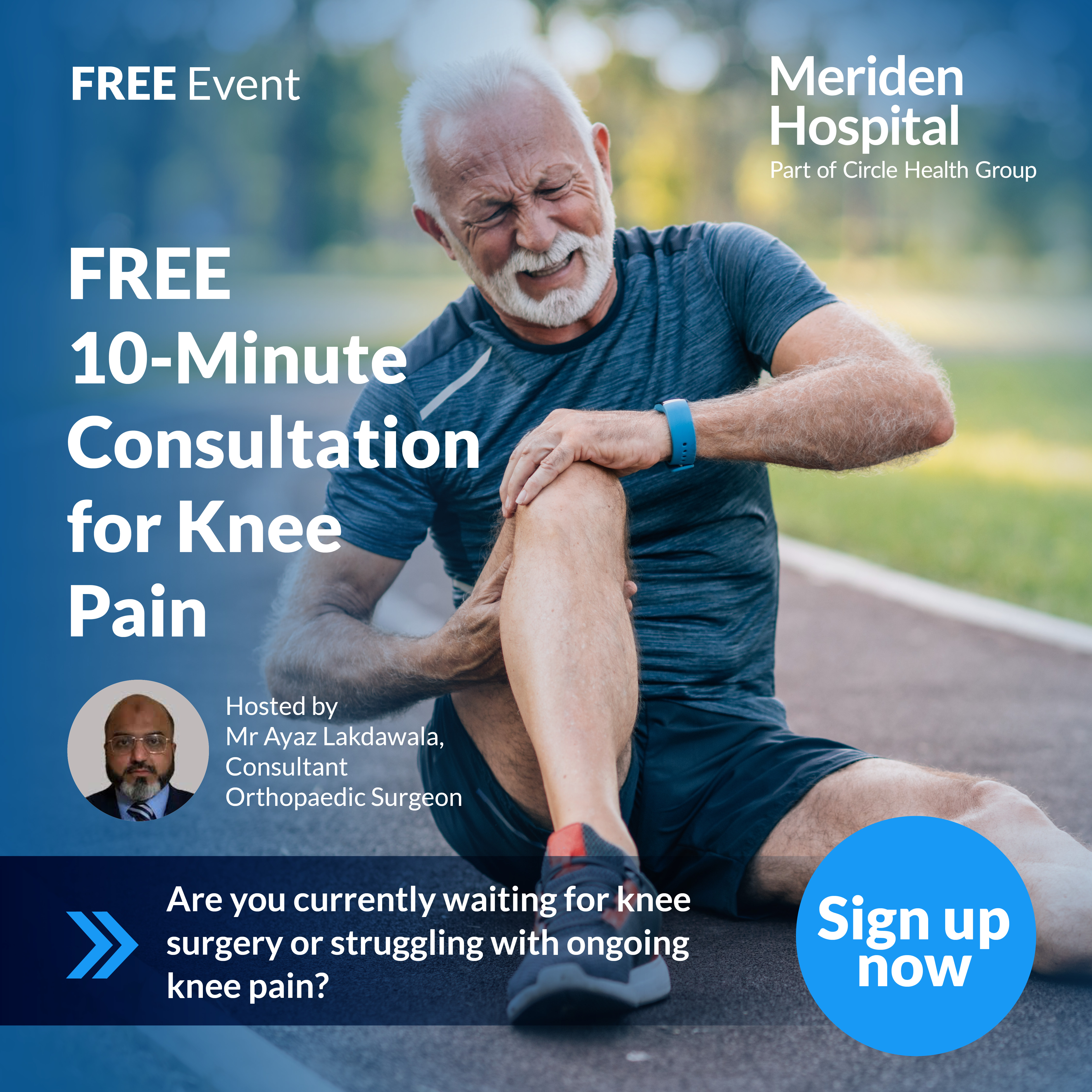 Join us at The Meriden Hospital for a FREE 10-minute consultation with Mr Ayaz Lakdawala, our highly experienced Consultant Orthopaedic Surgeon specialising in knee conditions and sports injuries. With over 16 years of experience and a strong reputation for managing complex cases, Mr Lakdawala provides clear, honest advice tailored to your individual needs.