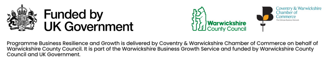 “The Business Resilience and Growth programme forms part of the Business Growth Warwickshire programme. It is delivered by Coventry and Warwickshire Chamber Of Commerce on behalf of Warwickshire County Council”.